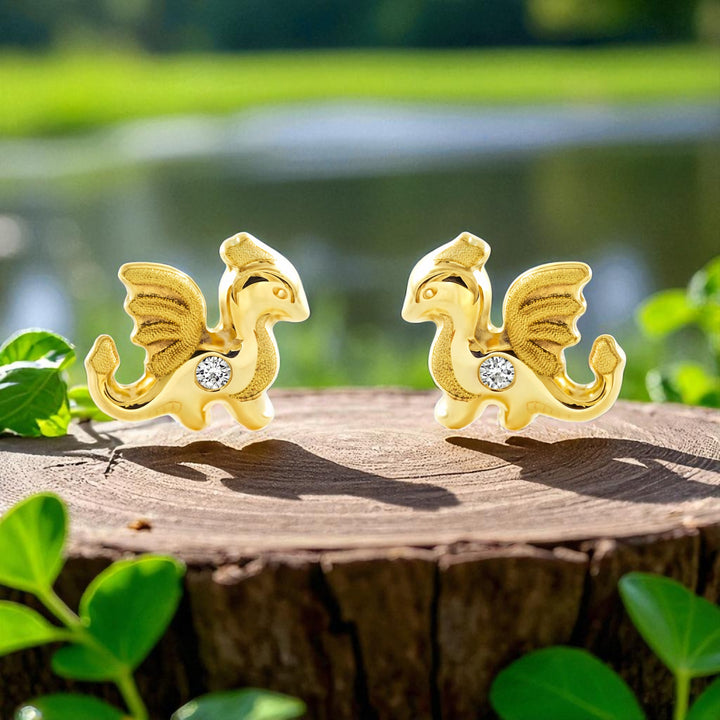 Boucles d'Oreilles Enfant Dragon Zircone Mate et Brillant Or Jaune 9 Carats