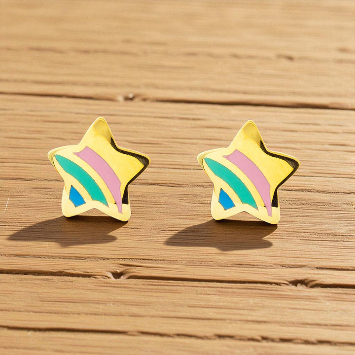 Boucles d'Oreilles Enfant Étoile Émail Multicolore Or Jaune 9 Carats Brillant