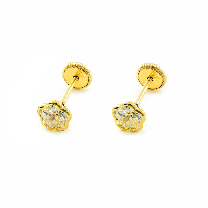 Fabriquées en or jaune de haute qualité, ces boucles d'oreilles se distinguent par leur forme de fleur et l'éclat intense du zircon central. Leur design sûr et confortable est parfait pour les plus petites, garantissant élégance et durabilité dans chaque détail.