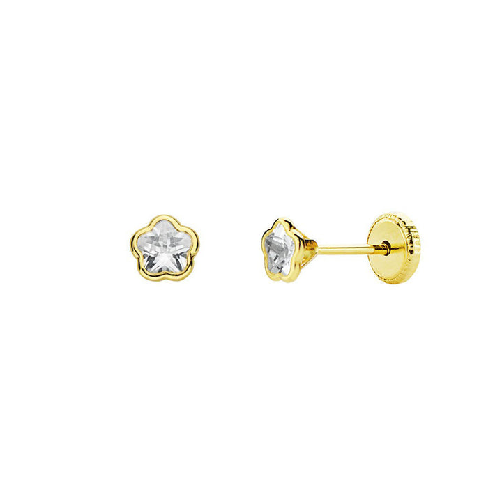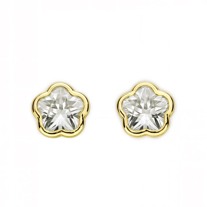 Boucles d'Oreilles Enfant Or Jaune 9 Carats Fleur Pierre Zircone Brillant