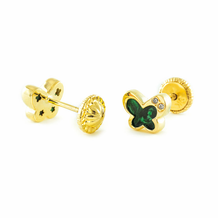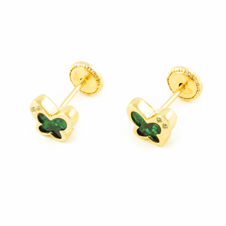 Pendientes Niña oro Amarillo 9K Mariposa Piedra Malaquita Verde Brillo