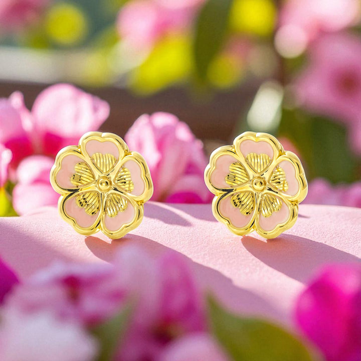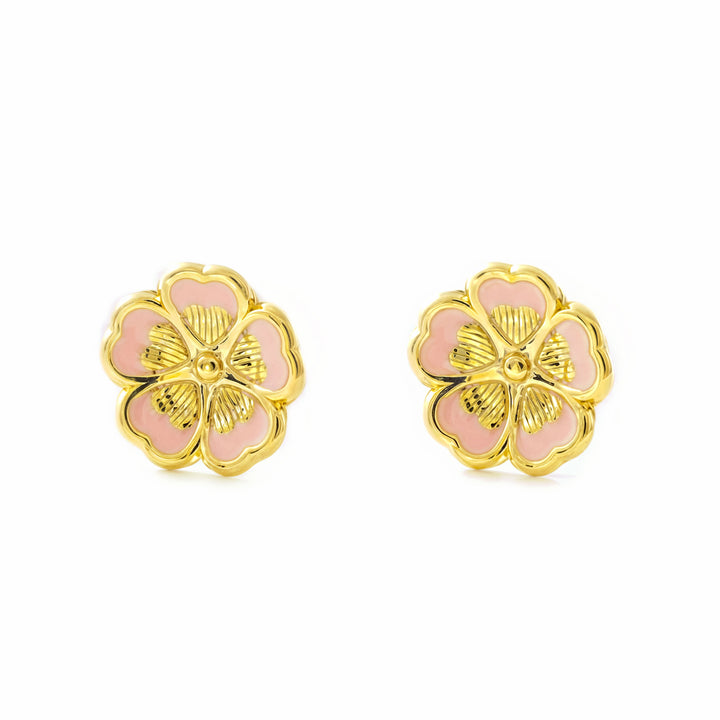 Boucles d'Oreilles Femme Enfant Fleur Émail Rose Or Jaune 9 Carats Brillant et Texturé