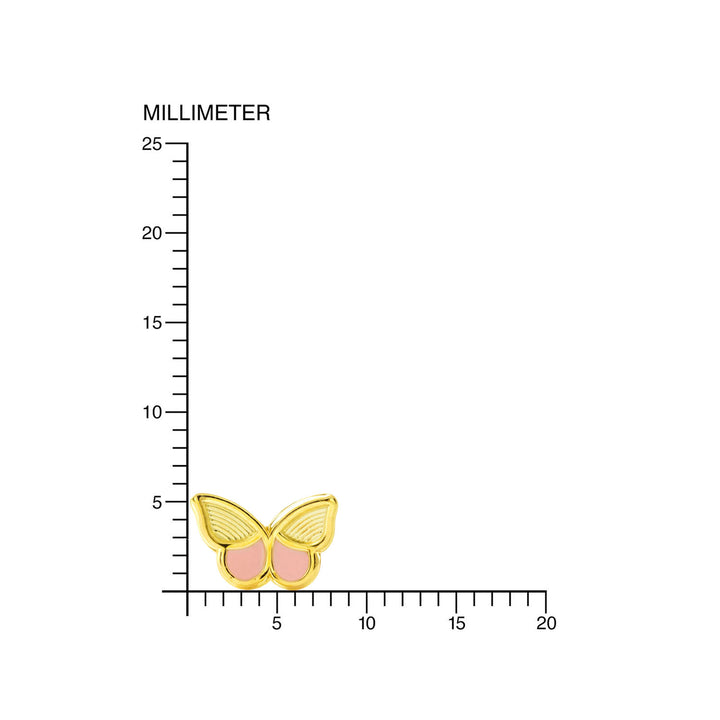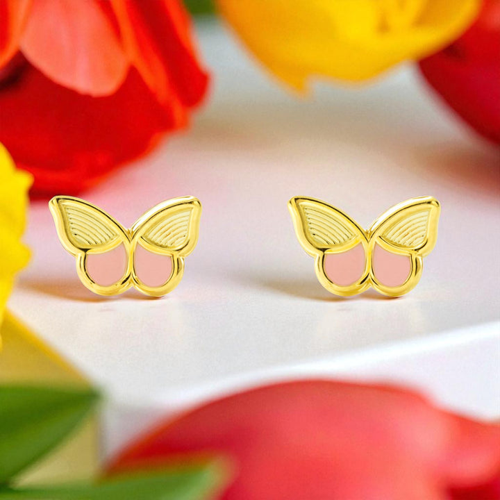 Boucles d'Oreilles Femme Enfant Papillon Émail Rose Brillant et Texturé Or Jaune 9 Carats